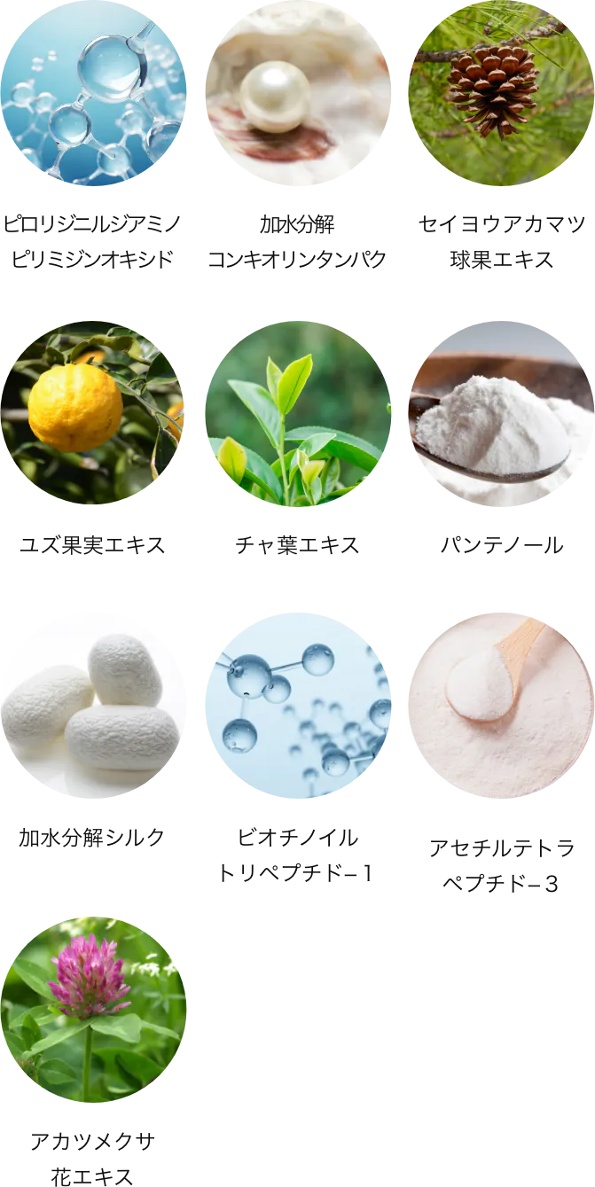 水、ステアリン酸グリセリル、(アクリレーツ/アクリル酸エチルヘキシル)コポリマー、エタノール、ミツロウ、カルナウバロウ、ステアリン酸、イソステアリン酸デキストリン、ペンチレングリコール、AMPD、コメヌカロウ、ステアリン酸ソルビタン、アカツメクサ花エキス、アセチルテトラペプチド-3、ビオチノイルトリペプチド-1、セイヨウアカマツ球果エキス、加水分解コンキオリンタンパク、ピロリジニルジアミノピリミジンオキシド、ポリクオタニウム-61、加水分解シルク、ユズ果実エキス、チャ葉エキス、パンテノール、スクワラン、ルイボスエキス、ヒアルロン酸Na、加水分解コラーゲン、加水分解エラスチン、プルラン、フラーレン、グリセリン、ピロ亜硫酸Na、デキストラン、塩化亜鉛、タルク、ラウレス-21、ポリビニルアルコール、1,2-ヘキサンジオール、トコフェロール、グリシン、PVP、BG、酸化鉄