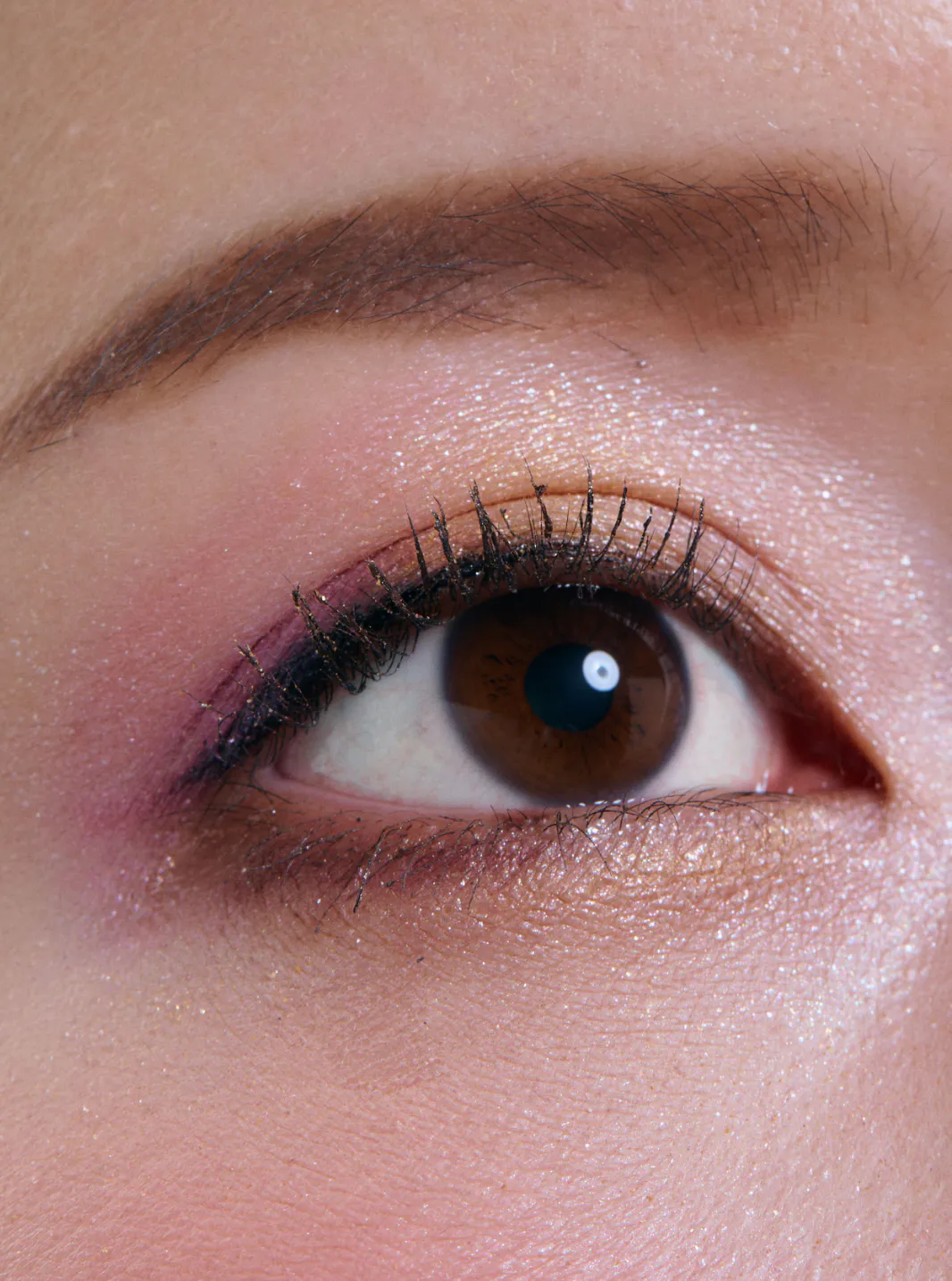 まぶたを持ち上げて、まつげの根元にブラシを横に当て、上方向に持ち上げながら、毛先に向かってすっとブラシを抜きます。
