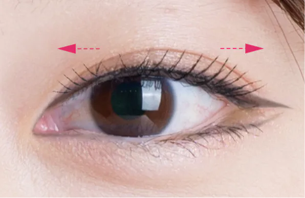 ブラシの先端を使って目尻につけます。まぶたを少し引き上げるとつけやすく、縦ブラシ使いは長さをだすことができます。