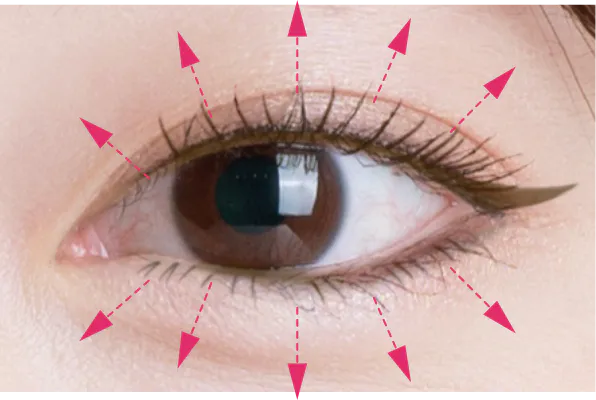まつ毛を矢印の方向へ放射状に全体にマスカラをぬって強調します。