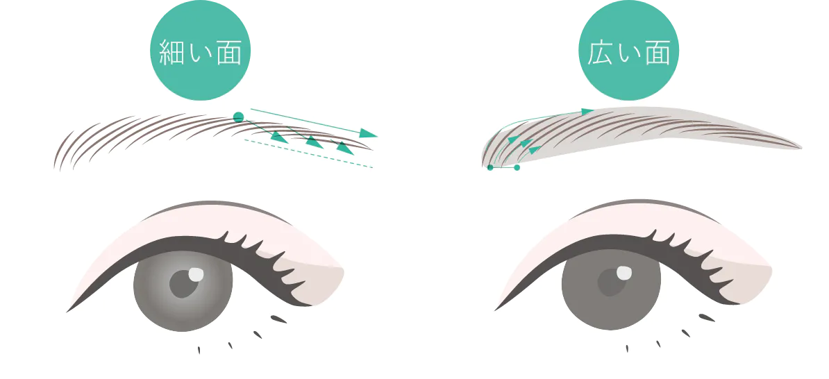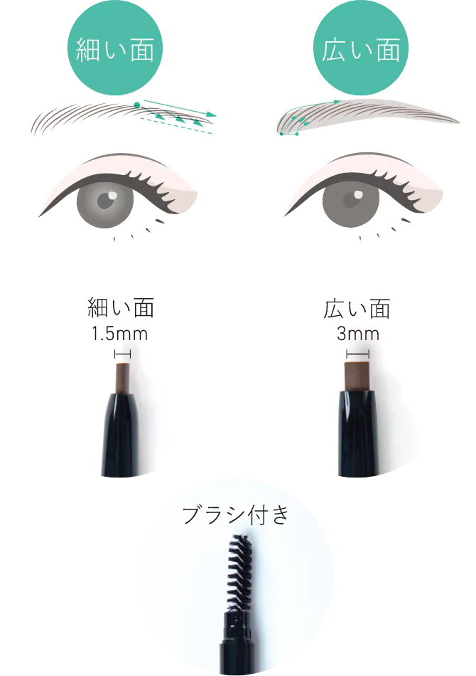オーバル形の芯で、芯の細い面を使い、眉尻に一本一本毛を足すように使えます。また広い面でパウダーブラシで描くようにふんわりと柔らかい太眉を描けます。