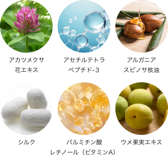 ベヘン酸、水添ヒマシ油、水添パーム核油、合成モクロウ、ステアリン酸水添ヒマシ油、ヤシ油、カルナウバロウ、アルガニアスピノサ核油、パンテノール、パルミチン酸レチノール、ウメ果実エキス、デキストラン、アカツメクサ花エキス、アセチルテトラペプチド-3、シルク、コーン油、水、トコフェロール、セスキイソステアリン酸ソルビタン、BG、酸化鉄、酸化チタン、マイカ、水酸化Al