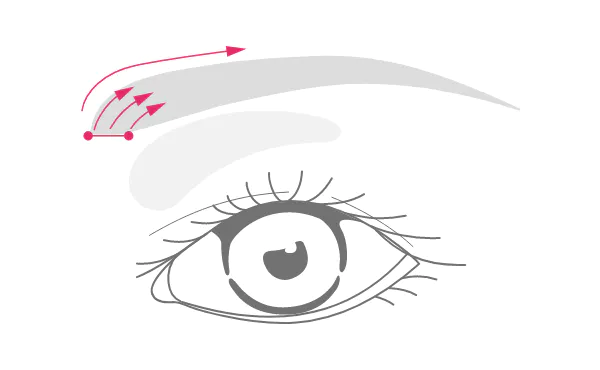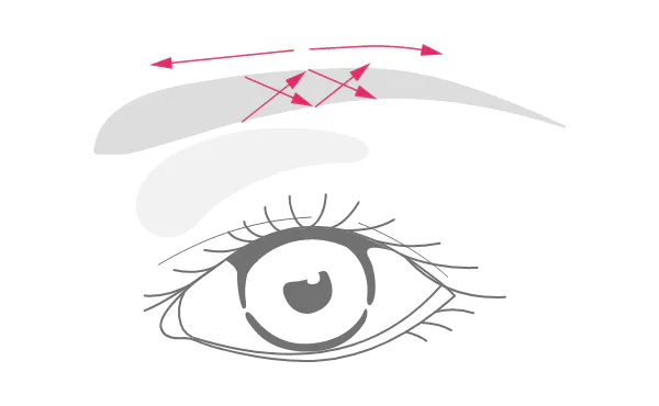 目頭を決め、眉頭の足りない部分を、毛の流れに沿って、下から上に薄く描き足し、スクリューブラシでなじませます。