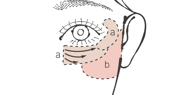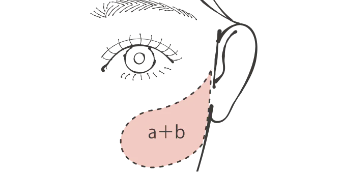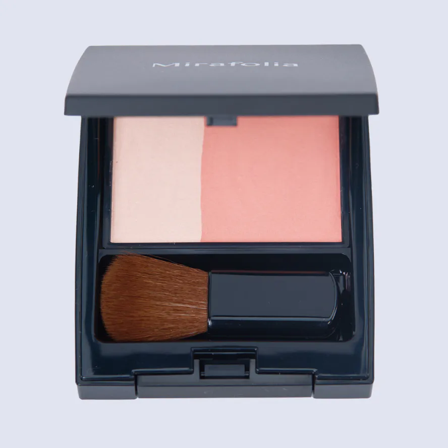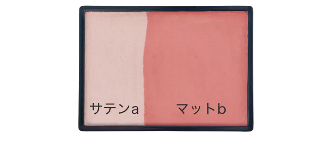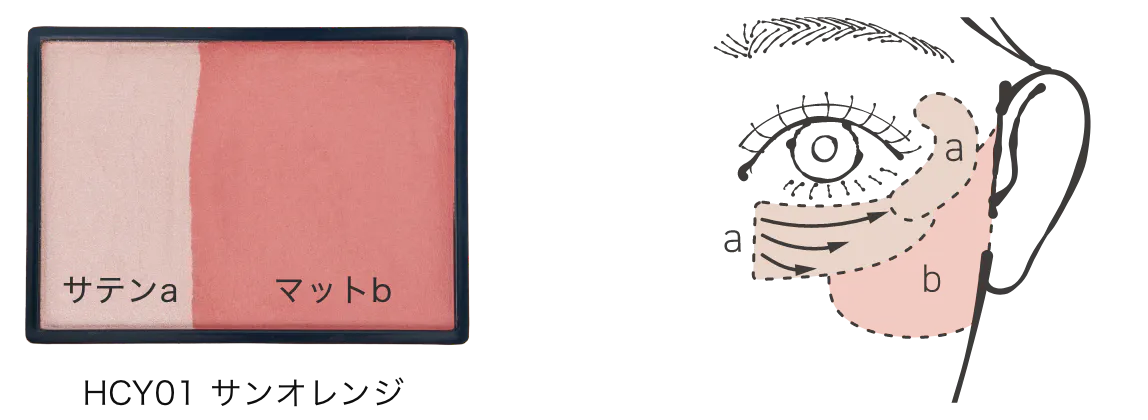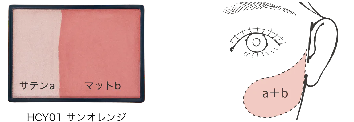 ①a+bを混ぜ、頬骨の高い位置をふんわり丸く囲み、耳の方向にぼかしグラデーション。