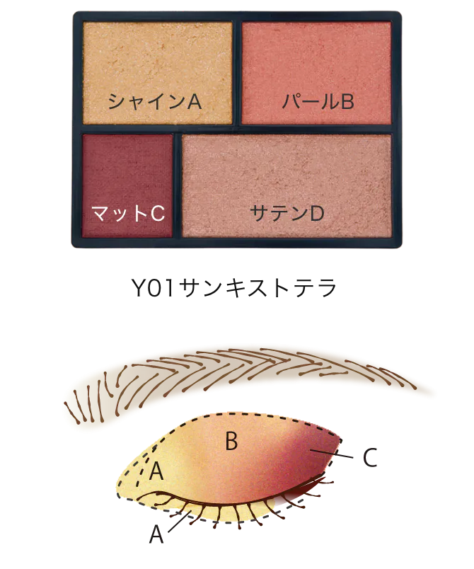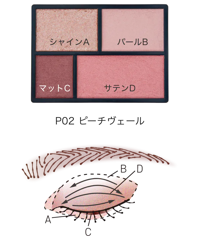 ①B:まぶた全体にのせ、ベースを整える。