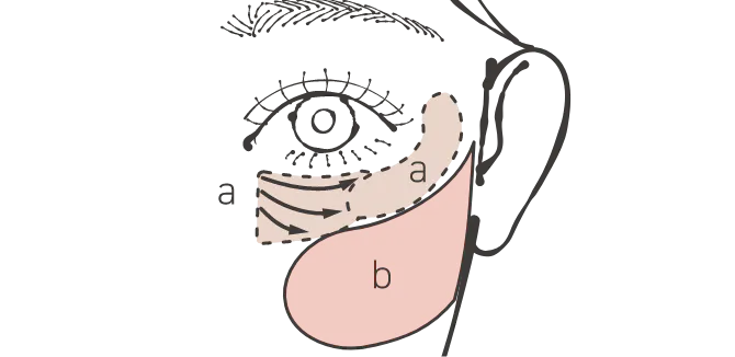 ②a:目の下三角ゾーンとCラインに入れ、明るさとツヤをアップ。