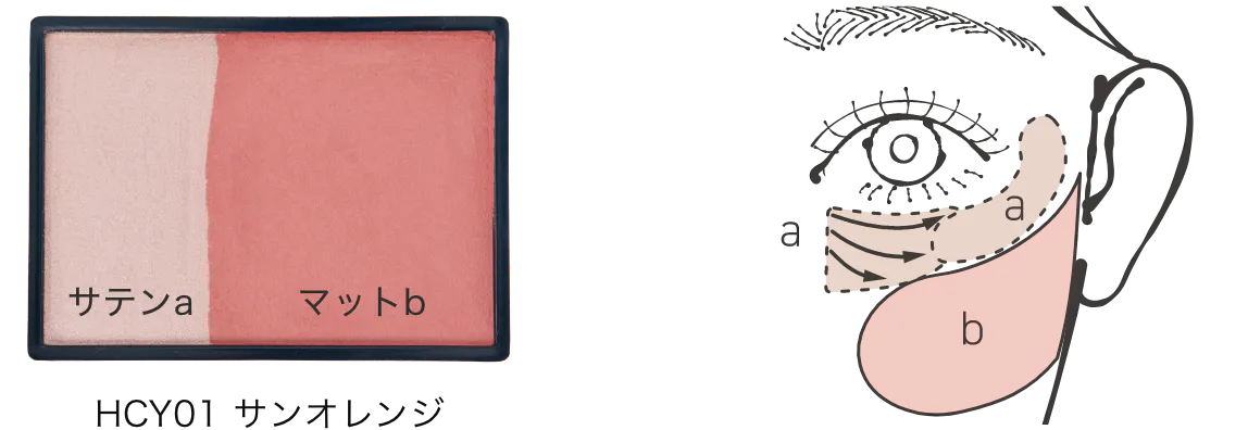 ②a:目の下三角ゾーンCゾーンからアイホールにつながるよう、ふんわり広げる。ハイライトを鼻根、目頭、鼻先にいれ立体感とツヤをプラス。