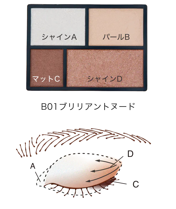 ②B:二重の幅と目尻側にも重ね、馴染ませる。