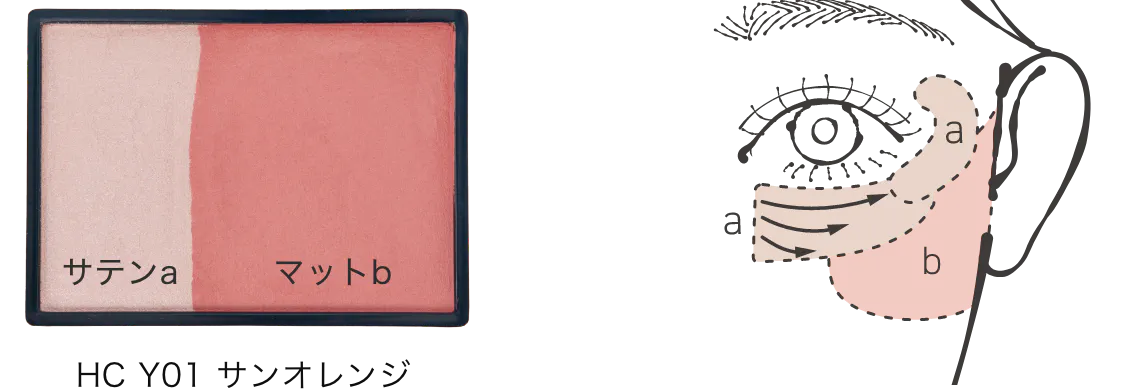 ①b:頬骨を囲むように、丸くふんわりと入れ、血色感のある印象に。