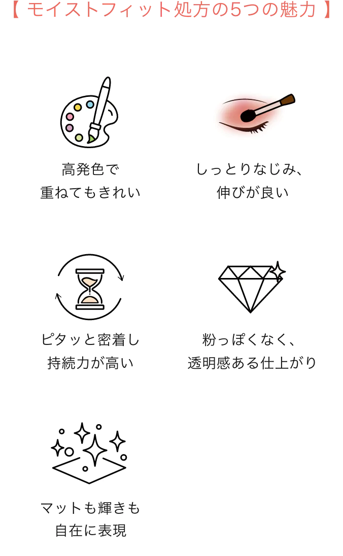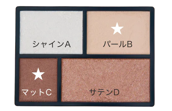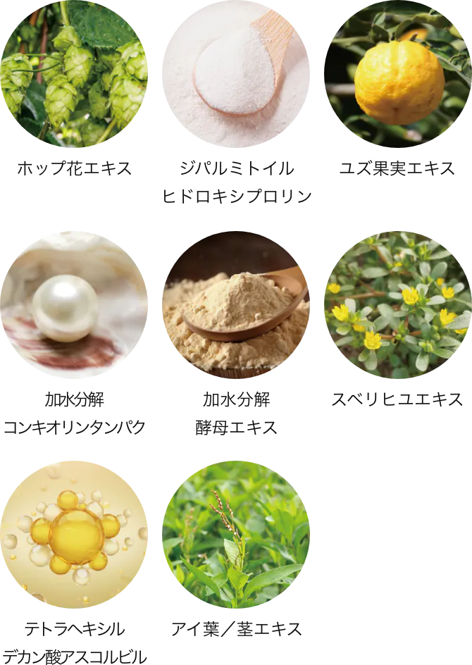マイカ、トリエチルヘキサノイン、ヘキサ(ヒドロキシステアリン酸/ステアリン酸/ロジン酸)ジペンタエリスリチル、アラントイン、アルガニアスピノサ核油、オリーブ果実油、テトラヘキシルデカン酸アスコルビル、ホホバ種子油、シア脂、α-グルカン、グルコシルセラミド、加水分解酵母エキス、ホップ花エキス、ローヤルゼリーエキス、アイ葉/茎エキス、チャ葉エキス、オウゴン根エキス、ノイバラ果実エキス、加水分解コンキオリンタンパク、ユズ果実エキス、スベリヒユエキス、ローズマリー葉エキス、マグワ根皮エキス、ジパルミチン酸アスコルビル、ジパルミトイルヒドロキシプロリン、セスキイソステアリン酸ソルビタン、トコフェロール、BG、水、(+/-)タルク、シリカ、ミリスチン酸Ca、ホウケイ酸(Ca/Al)、パルミトイルプロリン、パルミトイルサルコシンNa、パルミトイルグルタミン酸Mg、テトライソステアリン酸ポリグリセリル-2、パルミチン酸、カルミン、グンジョウ、カオリン、水酸化Al、ステアリン酸、酸化亜鉛、酸化チタン、酸化鉄