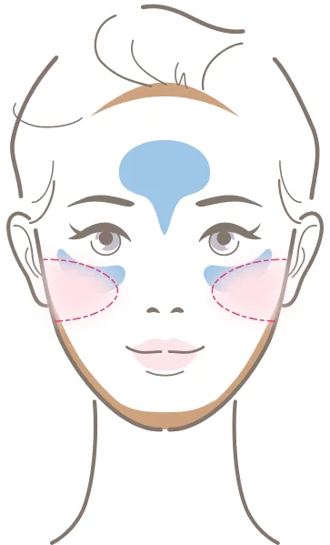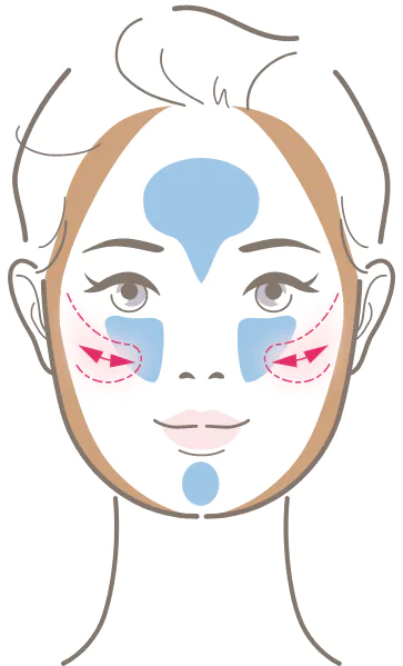 - 額とあご下に入れて縦の長さを短く見せます。耳下からあご先に。