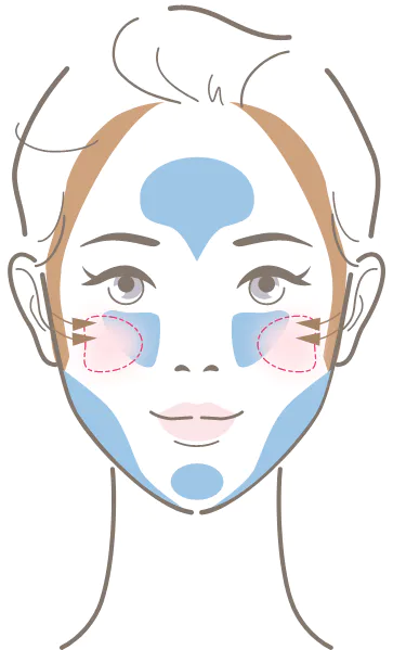 - 頬に真横にのせて、フェイスラインは広めにのせ、ぼかします。