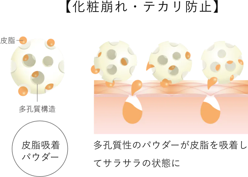 皮脂を吸着するパウダーを配合。サラサラとした肌触りのよい状態を保ち、ファンデーション等の化粧ノリをよくします。